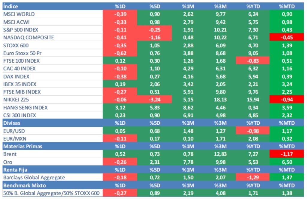 Por su parte, la renta fija después de varios días de caídas en las rentabilidades de los bonos (subidas de precios), volvió a ceder (subida de las TIRES). Los inversores no las tienen todas consigo (insistimos en los datos de IPC que ya sorprendieron negativamente en la última ocasión) y están optando por “plegar velas”.