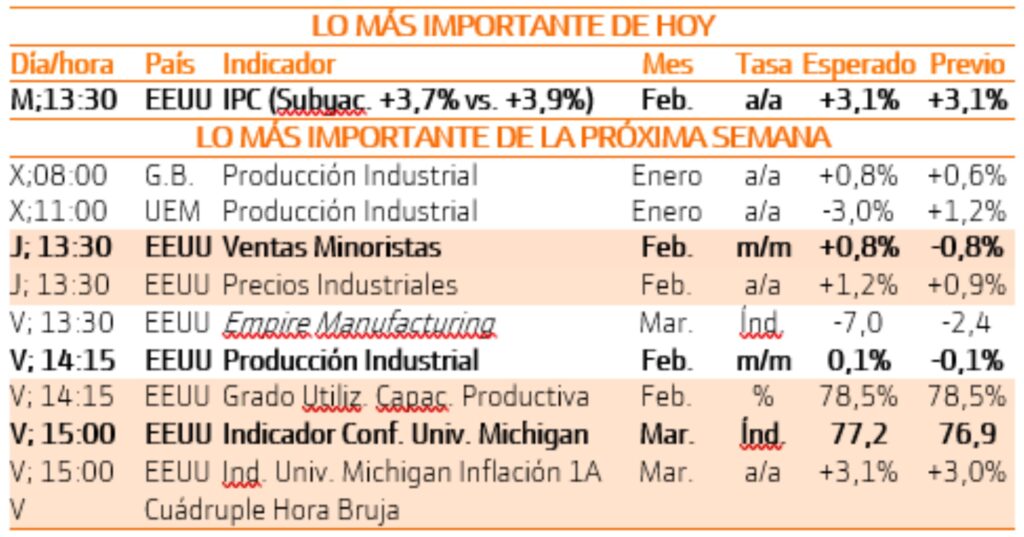 Y es que el consenso de mercado espera un IPC general en el 3,1% (frente al 3,1% anterior) y un IPC subyacente, sin alimentos y energía, en el 3,7% frente al 3,9% del mes anterior. A pesar de que dichos datos se mantienen todavía lejos del objetivo de la Fed del 2%, el cumplimiento de las expectativas reforzaría la idea de 4 bajadas de los tipos por importe de 25 puntos básicos cada una a lo largo del año y de que el proceso desinflacionista sigue su curso. Con todo, recordemos que dichas expectativas ya se han movido de las 7 bajadas previstas a principios de este año y que comenzarían en marzo a las 4 mencionadas que se iniciarían en junio. Nosotros seguimos pensando que incluso el actual consenso de mercado es optimista.