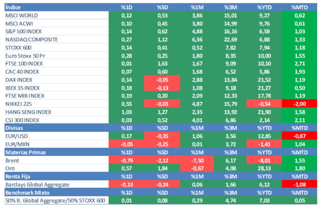 De esta manera, los índices acabaron cerca de sus máximos del día, recuperándose de las caídas con las que amanecieron. Lo sectores más defensivos (eléctricas, farmacéuticas, alimentación, defensa, telecomunicaciones) fueron los que mejor lo hicieron junto con los bancos. Por el contrario, los más expuestos a los aranceles (automóvil, lujo) no tuvieron su día. En Wall Street, el Nasdaq alcanzó máximos históricos después de cerrar con una subida del 0,27%, acumulando una revalorización del 6,89% en el conjunto del año. Recordemos, que en abril llegó a registrar una caída del 20,7% anual.