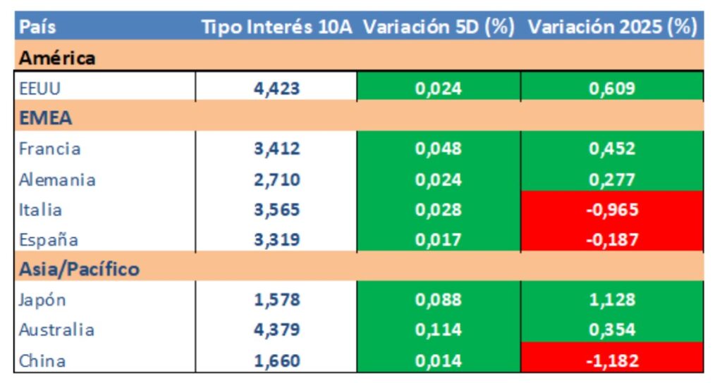 En renta fija, estabilidad en los bonos, a la espera de conocer hoy el dato de inflación general y subyacente en los EE.UU. El mercado espera un repunte hasta el 2,6% desde el 2,4% en la general y del 2,9% desde el 2,8% en la subyacente (inflación que no tiene en cuenta alimentos ni energía). La mayoría de los inversores esperan dos rebajas de tipos de interés por parte de la Fed en lo que queda de año, expectativa optimista bajo nuestro punto de vista. El presidente de la Fed ha insistido que a lo largo del verano se verán los efectos en precios de la política arancelaria y que conviene esperar para tomar una decisión.
