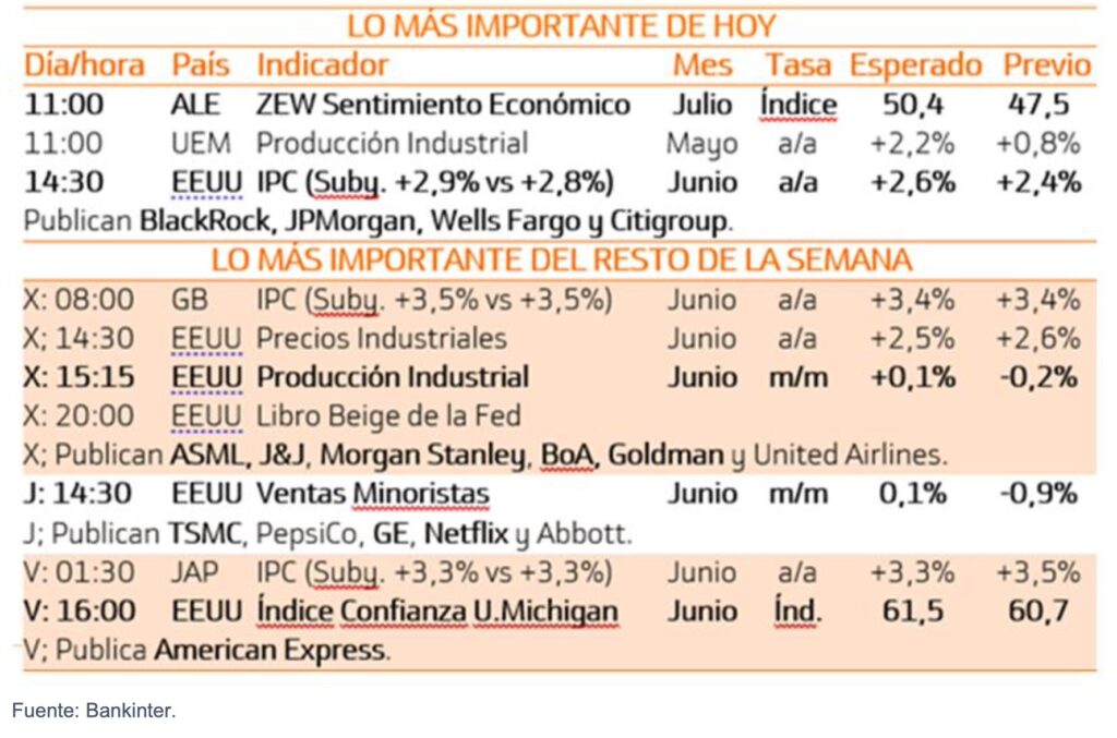 Por otro lado, comienza la temporada de resultados empresariales de manera más oficial, con los grandes bancos estadounidenses dando a conocer sus cifras. Hoy presentan Citigroup, JP Morgan y Wells Fargo. Se espera que, como en el trimestre anterior, el trading y la banca de inversión sean el motor y les permitan mejorar la retribución al accionista. Recordemos que el mercado espera un aumento de los beneficios del S&P del 4,8% interanual (frente al 13% del primer trimestre).