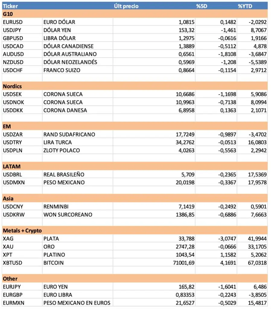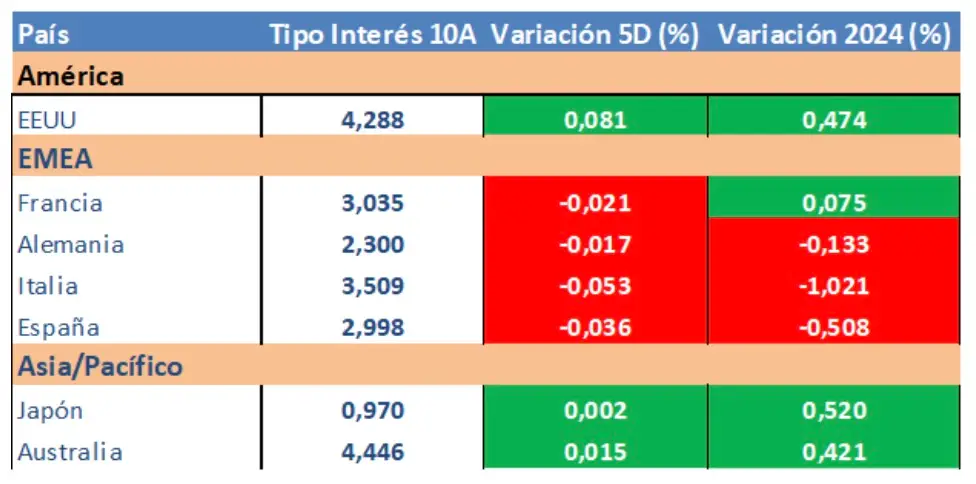 Lo anterior, no se vio reflejado en la renta fija estadounidense, donde ayer asistimos a un nuevo repunte de la rentabilidad del bono a 10 años americano que ya se encuentra en el 4,27%. El hecho de que Trump esté ganando terreno en las encuestas y que tenga un programa, en principio, más deficitario, sigue lastrando a la renta fija. En lo que llevamos de mes, la TIR del bono americano ha subido 50 puntos básicos.