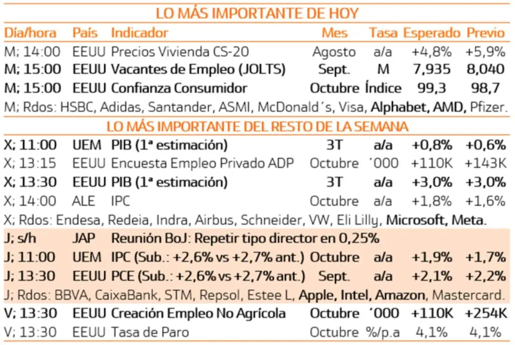 Por último, y ya en el plano macroeconómico, hoy conoceremos los datos de confianza de octubre de Alemania y de EE.UU. donde se espera una ligera mejora en ambos casos. También estaremos atentos a los datos de empleos ofertados del mes de septiembre de EE.UU (JOLTS), donde se espera una ligera bajada después del sorprendente dato al alza del mes precedente.