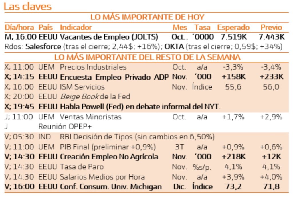 El resto de la semana vendrá marcado por una comparecencia del presidente de la Fed mañana miércoles y, sobre todo, la publicación del dato de empleo del mes de noviembre (el viernes) que nos llevará a contrastar realidad contra expectativas y veremos si el mercado laboral sigue confirmando esa fortaleza de la economía que descuenta el mercado.
