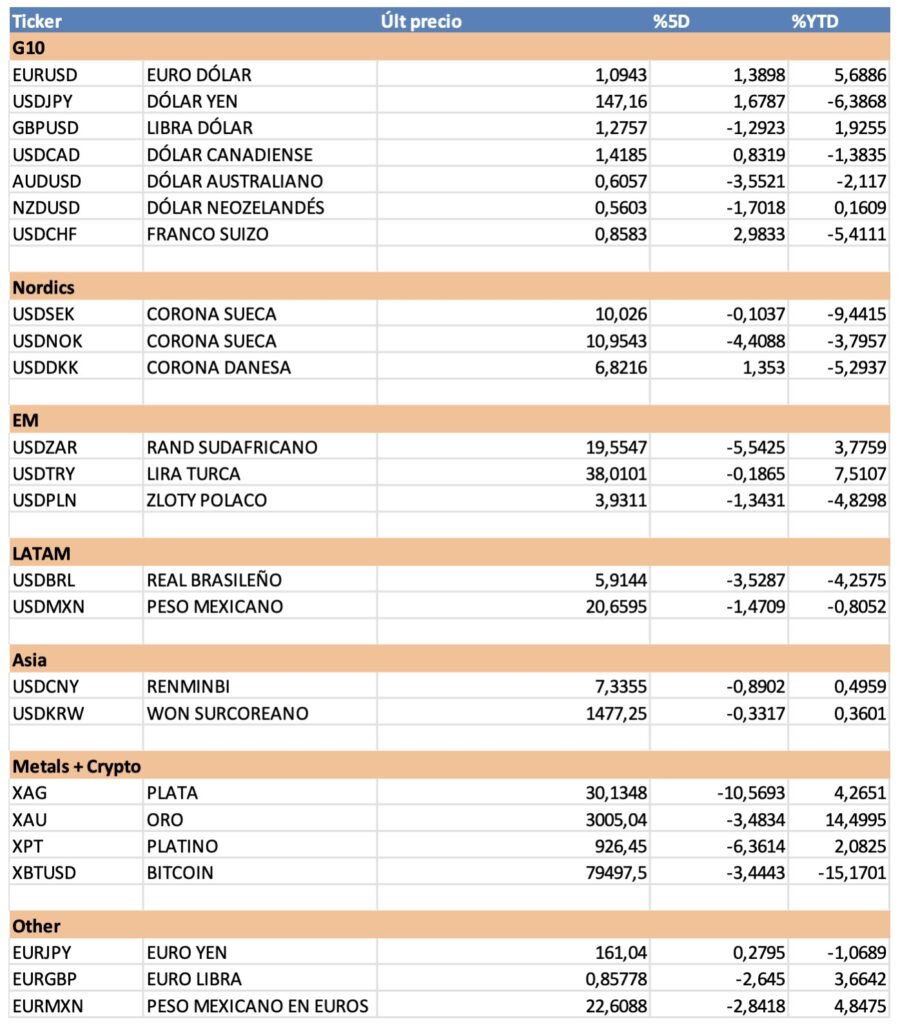 Por ahora, la respuesta de la mayoría de los países a las medidas arancelarias de Trump, está siendo bastante mesurada y se agarran a la negociación (buenas noticias). Prueba de ello es la Unión Europea, que está abogando por aranceles 0 en productos industriales y ha retrasado la entrada en vigor de aranceles a productos de aluminio y acero hasta mayo. Obviamente, son conscientes del negativo efecto sobre la inflación que tendría la aplicación de aranceles recíprocos.