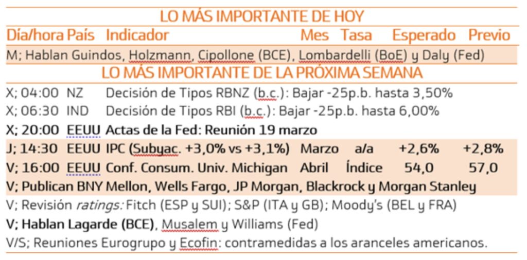 Por poner todo en contexto, los primeros análisis del impacto de los aranceles apuntan a una caída de los BPAs del Eurostoxx 50 del 6% y del 8% en el S&P. Las posibilidades de recesión de la economía estadounidense han subido al 63% y el efecto sobre el crecimiento europeo sería una caída del 0.6% en el crecimiento. Como pasa siempre en estos momentos de histeria, se produce un efecto de “pasada de frenada” en muchos valores, dejando unos niveles de valoración muy atractivos frente hace apenas unas semanas. Lo vemos en compañías de crecimiento y calidad como Nvidia o ASML, cotizando ya a 22 y 24 veces beneficios respectivamente, a pesar de su posición dominante frente a sus competidores. También hay muchas empresas europeas que, tras las recientes caídas, ofrecen rentabilidades por dividendo superiores al 7 % o bonos híbridos con rentabilidades internas del 6 % a menos de un año.