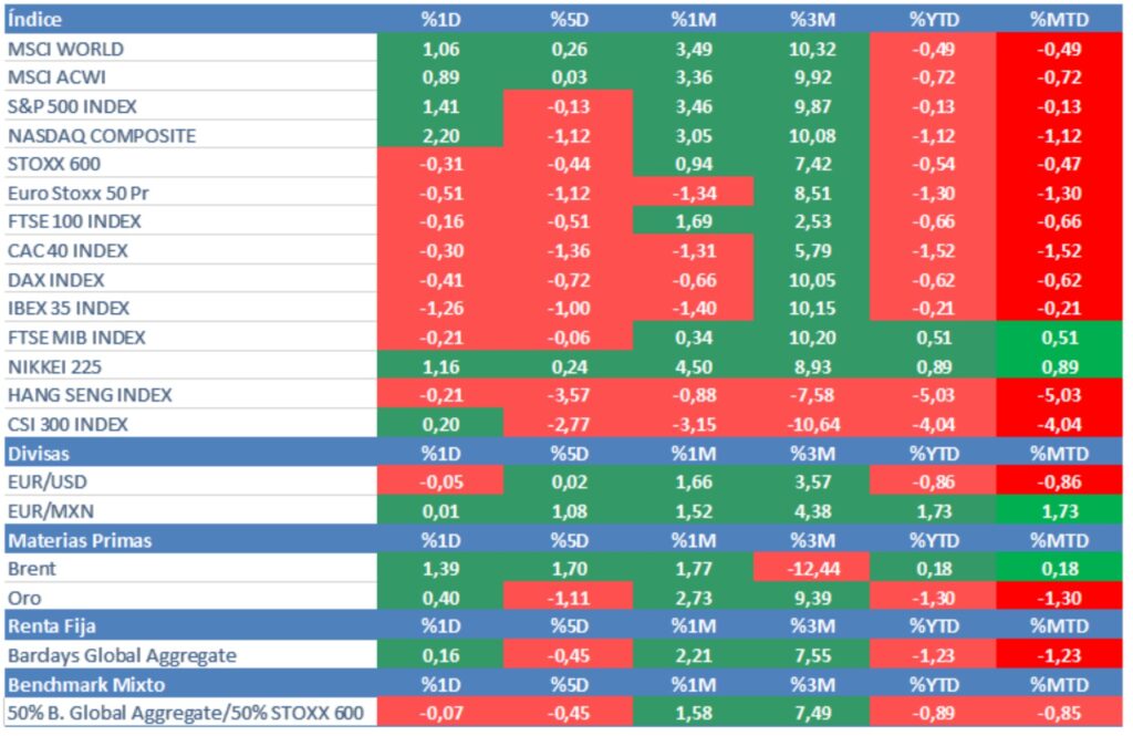 Después de unas primeras sesiones del año en la que los bonos retomaron la senda alcista en sus “TIRES” (bajada de precio y en la que diversos analistas alertaban de que el mercado se había pasado de frenada en las expectativas de bajadas de tipos para este año) y en la que ciertos sectores de renta variable habían experimentado toma de beneficios después de un cierre de año espectacular (tecnología, renovables, concesionarias, etc), la jornada de ayer fue de una cierta recuperación en los índices europeos y de una gran subida en los americanos. Las razones son varias:
