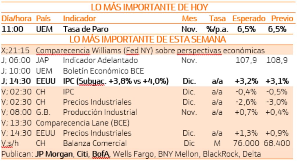 Esta semana estaremos atentos a los datos de inflación en EE.UU que conoceremos el jueves y que se esperan que repunten una décima hasta el 3,2% y el viernes arranca la presentación de resultados de cierre de año en los EE.UU con los bancos como protagonistas.